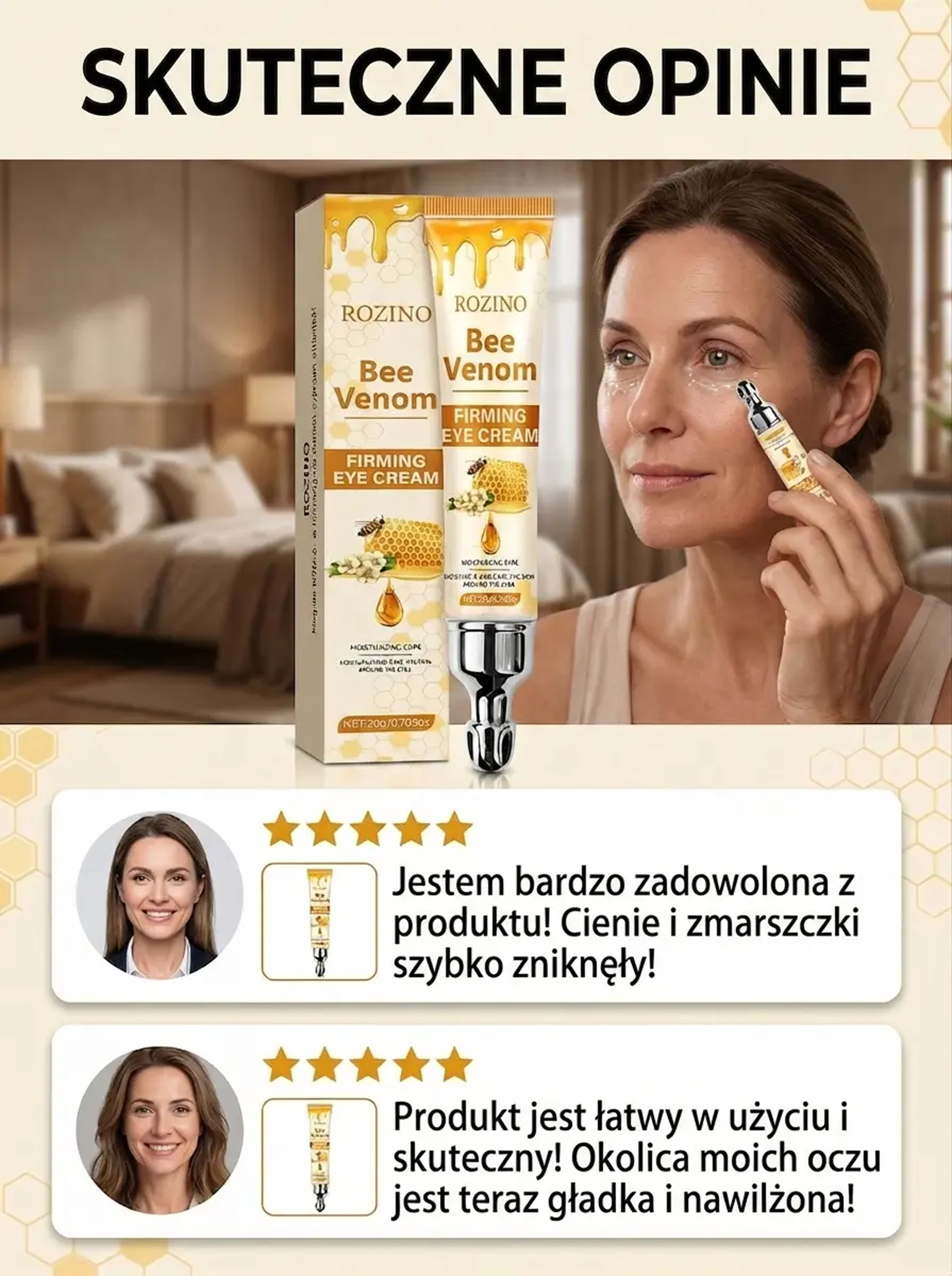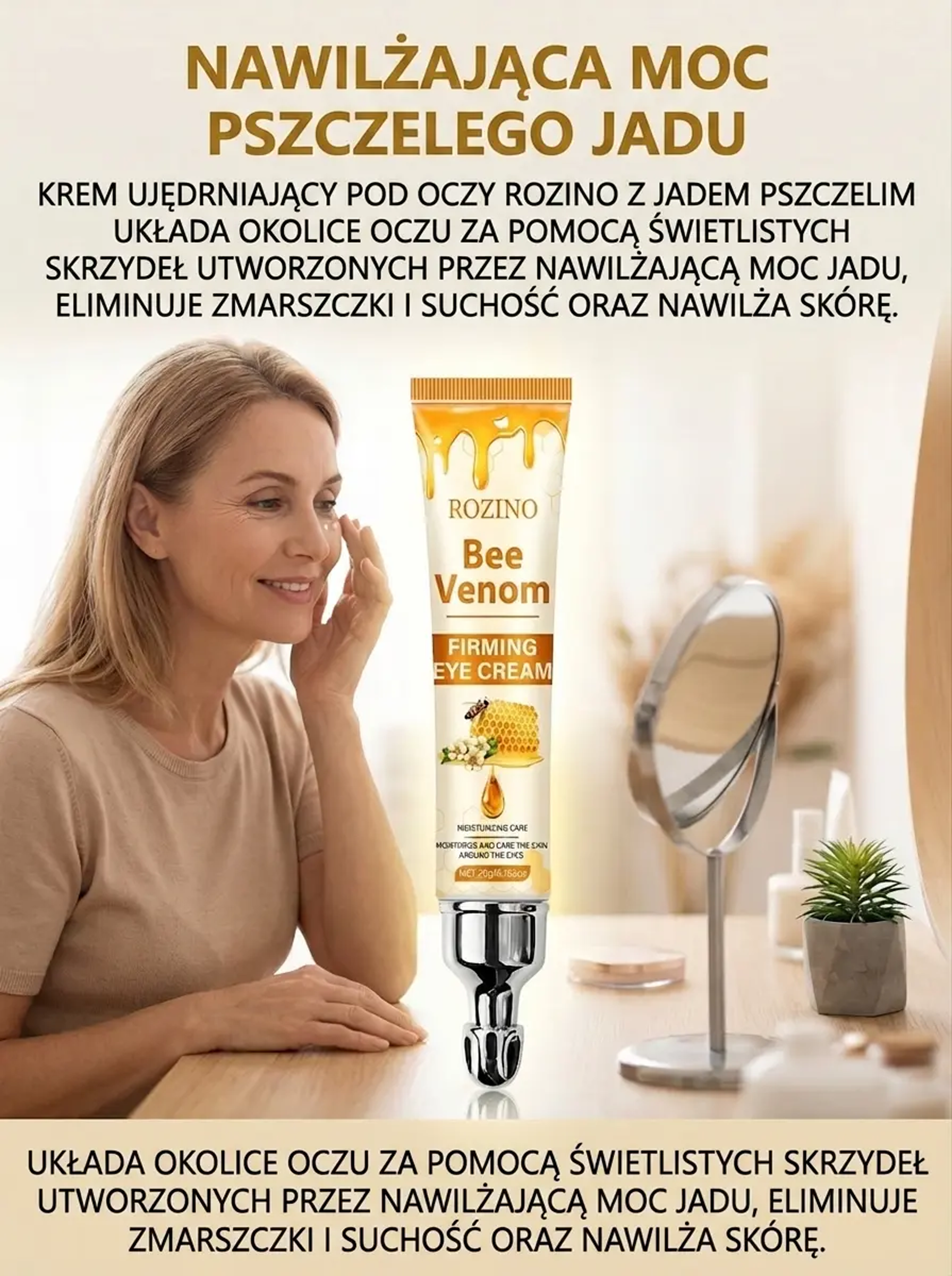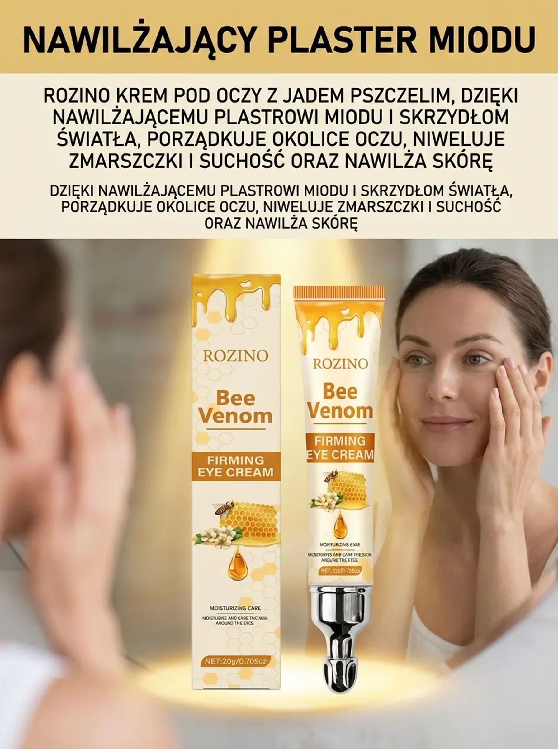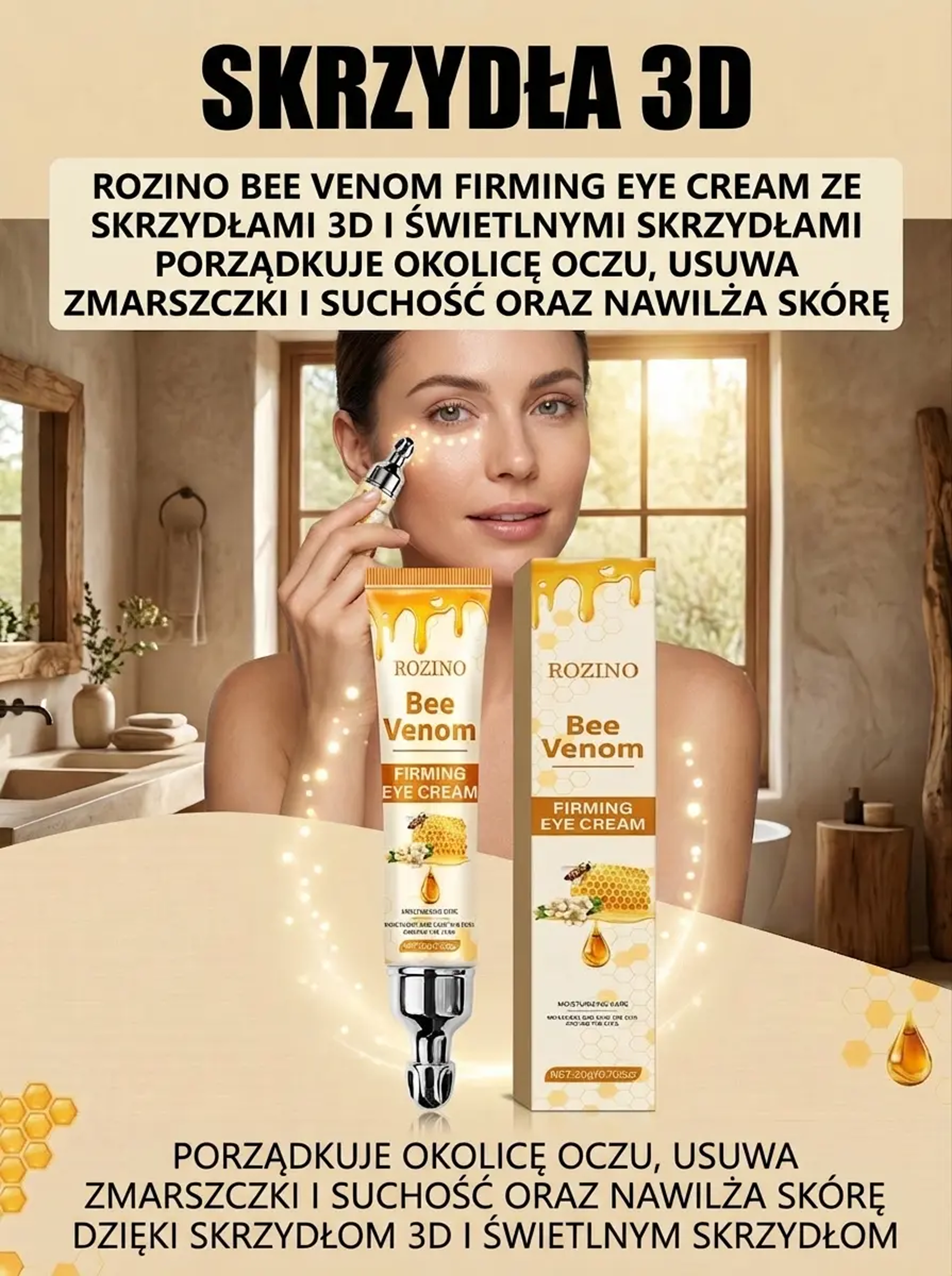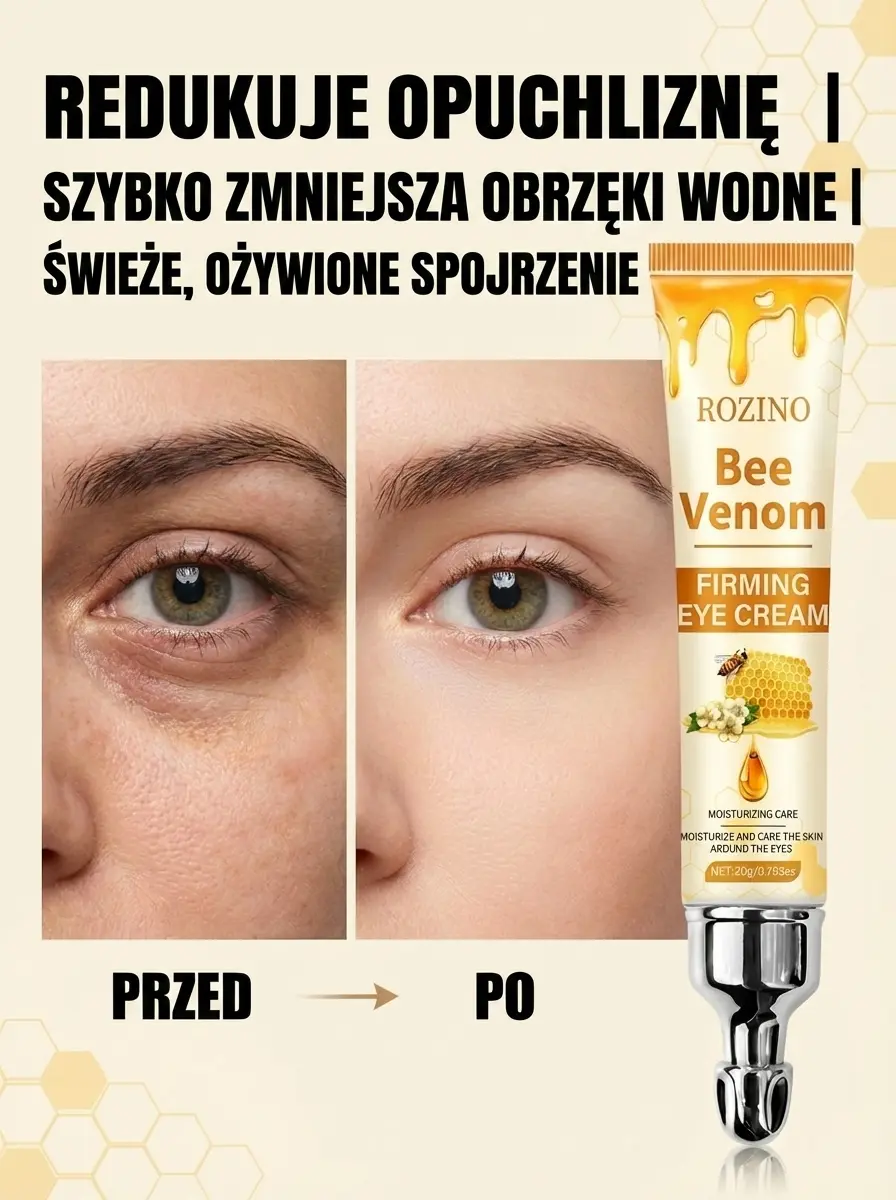Odmładzaj swoje spojrzenie każdego dnia – jędrna i gładka skóra wokół oczu! Ekstrakt z jadu pszczelego – wygładza zmarszczki i przywraca młodzieńczy blask oczom!