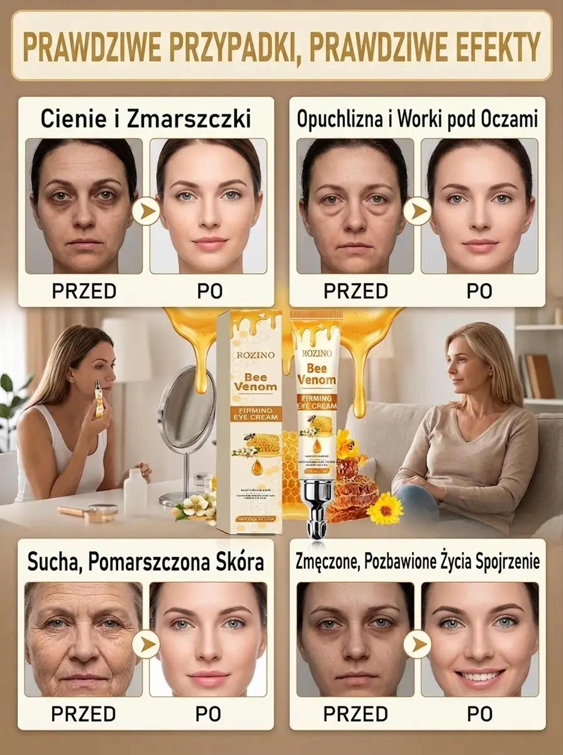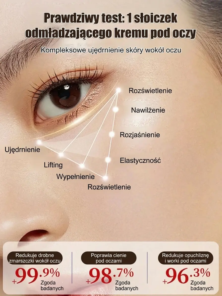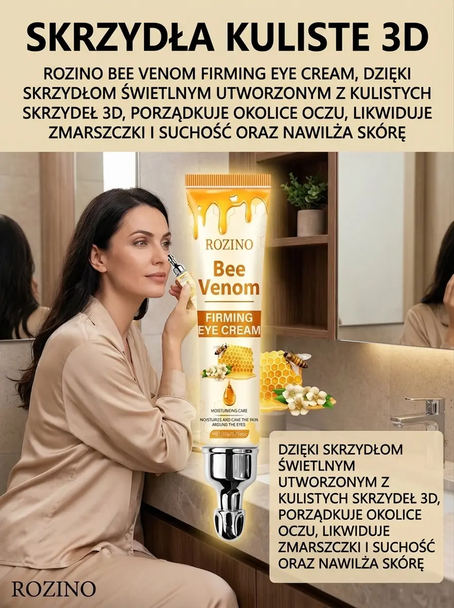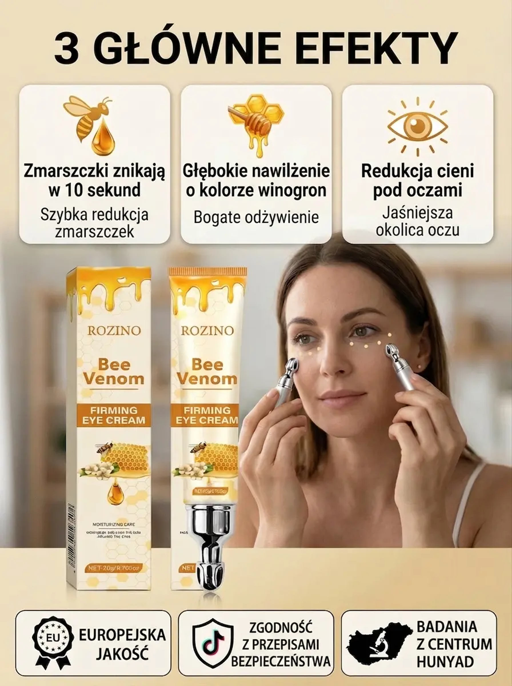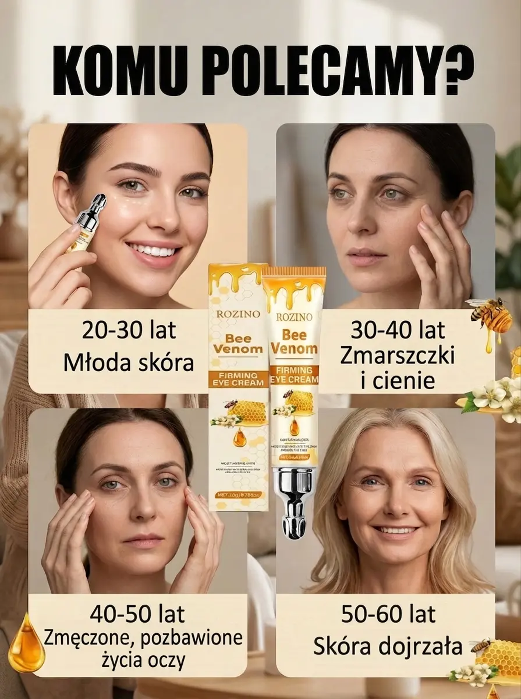 Odmładzaj swoje spojrzenie każdego dnia – jędrna i gładka skóra wokół oczu! Ekstrakt z jadu pszczelego – wygładza zmarszczki i przywraca młodzieńczy blask oczom!